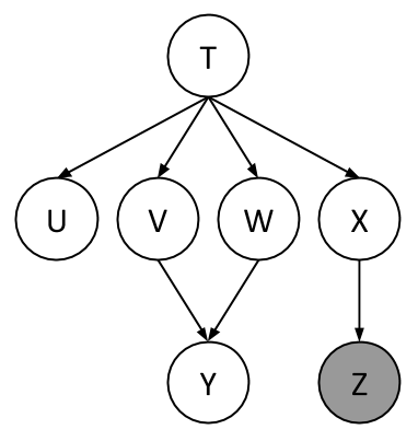 \[ P(T), \; P(U \mid T), \; P(V \mid T), \; P(W \mid T), \; P(X \mid T), \; P(Y \mid V,W), \; P(+z \mid X) \]