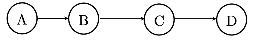 The first and third sequences have at most one variable change per row, and hence could have been generated from Gibbs sampling. In sequence 2, the evidence variable is changed. In sequence 4, the second and third samples have both \(B\) and \(D\) changing.
