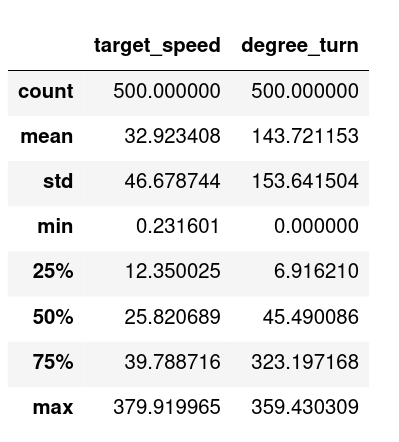 Some statistics from the collected dataset are shown below using drive.describe(), which returns the mean, standard deviation, quartiles, minimum, and maximum for the two columns in the dataset: target_speed and degree_turn.