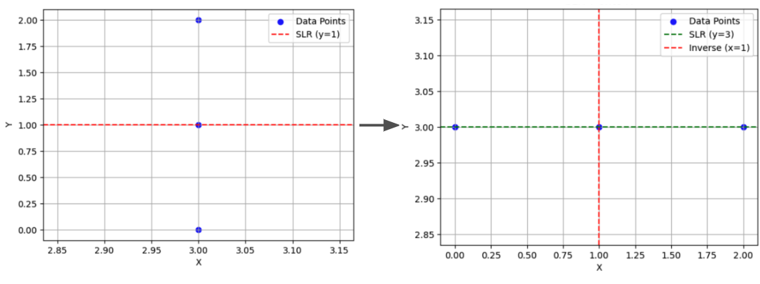 Have you ever wondered why we can’t just flip the regression line and use the inverse function \(f_\theta^{-1}(x)\)? The reason is that regression is directional.