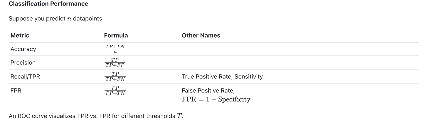 Here’s the “Classification Performance” section from the Spring 2025 Final Reference Sheet: