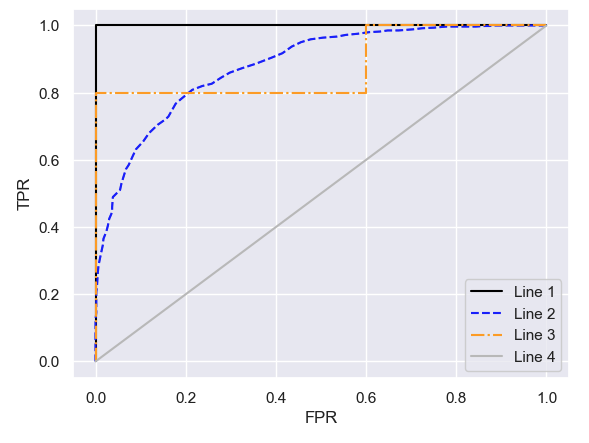 Line 1 (solid black line) is known as a “perfect predictor”; it always predicts the correct class for \(y\), so its true positive rate (TPR) is 1, and its false positive rate (FPR) is 0. Because we want our classifier to be as close as possible to the perfect predictor, we aim to maximize the AUC.