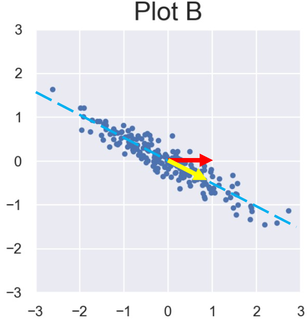 Most of the variance in Plot B lies roughly about a single line. The variance captured by the second PC is far smaller in Plot B compared to plots A and C. In both Plot A and Plot C, there are significant amounts of variance in two orthogonal directions, so PC1 would not be able to capture as much of the total variance.
