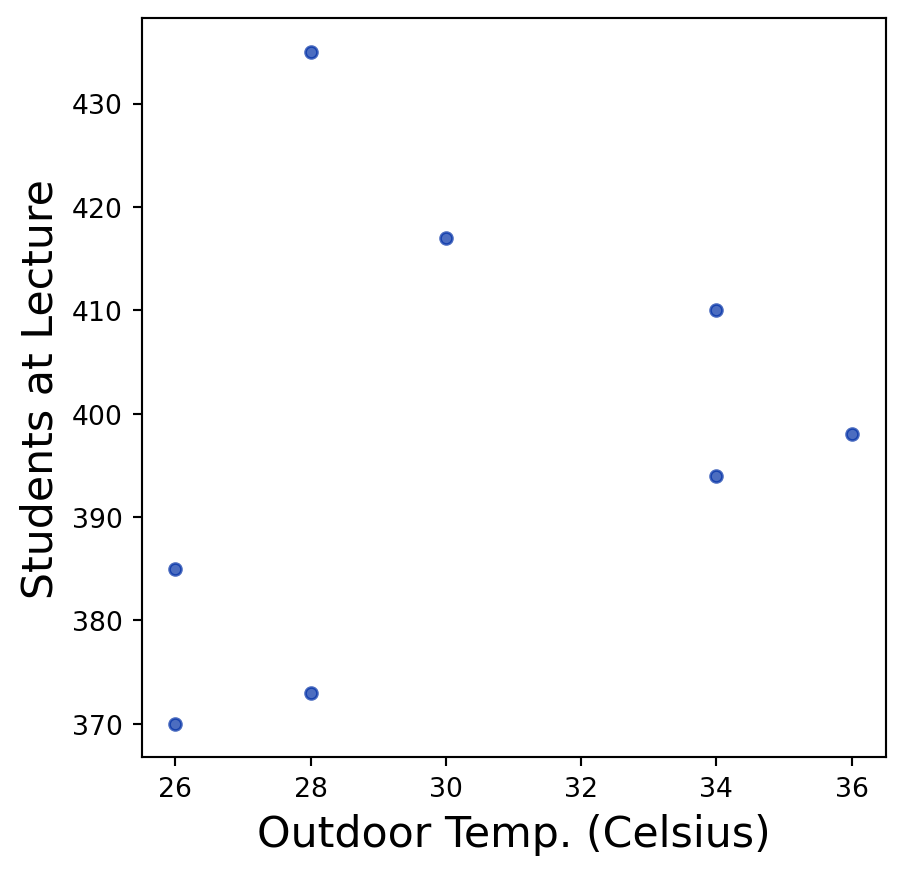 weather.select("Students at Lecture", "Outdoor Temp. (Celsius)").group("Outdoor Temp. (Celsius)", np.mean).relabeled("Students at Lecture mean", "Mean # Students at Lecture")| Outdoor Temp. (Celsius) | Mean # Students at Lecture |