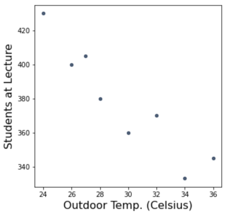Using our answer to part 4 and the visualization, is there a relationship between outdoor temperature and the number of students at lecture – an association, a causal relationship or something else? Why?