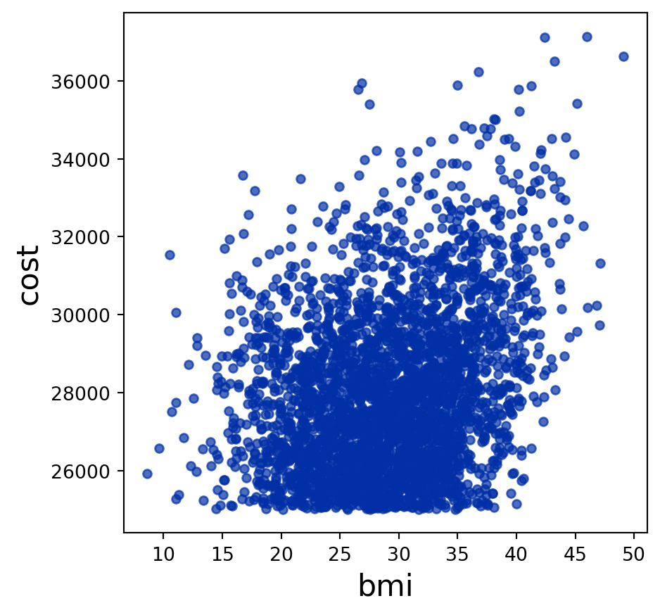 A scatter plot comparing the amount paid last year vs. BMI (titles are usually written as Y vs. X) for only the beneficiaries whose costs exceeded $25,000. Each dot on the scatter plot should represent one beneficiary.