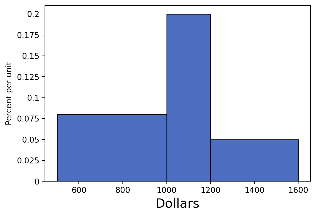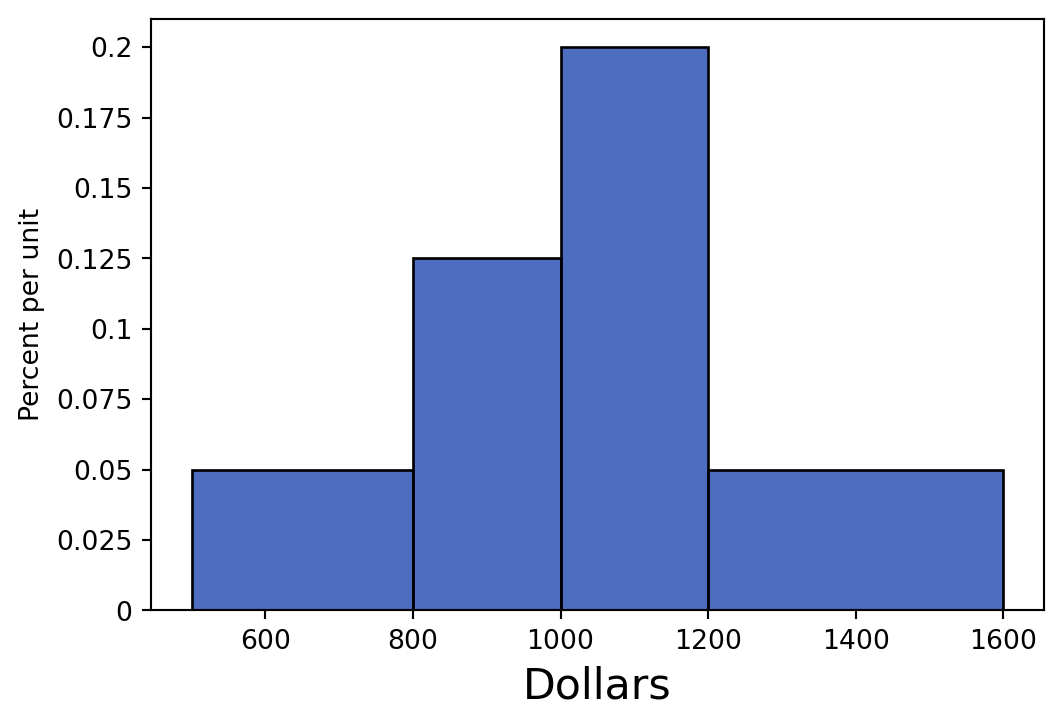 "Dollars", np.append(np.append(np.append(np.ones(15) * 600, np.ones(25) * 900), np.ones(40) * 1100), np.ones(20) * 1400)