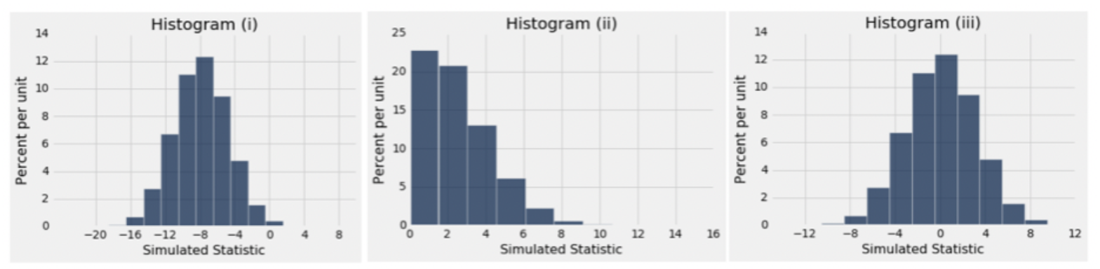 The researcher says, “The observed value of my test statistic is \(40\% - 48\% = − 8\%\).” To perform the test, the statistic is simulated under the null hypothesis. One of the figures below is the empirical histogram of the simulated values. Which is it?