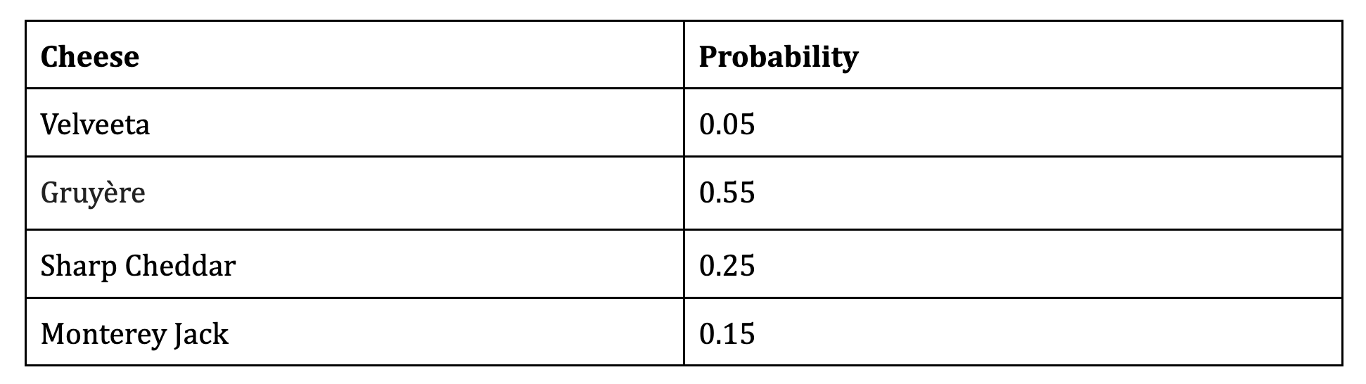 Chloe is a big fan of Trader Joe’s Frozen Mac ’n Cheese, but she noticed that the cheese used in it varies from box to box. A Trader Joe’s employee provides her with some data about the 4 different cheeses used and the probability of them being used in each box: