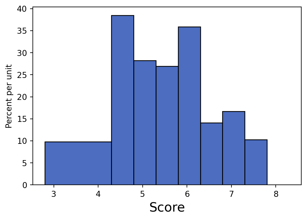 Each bin has width 0.5. We’re interested in the [4.3, 4.8), [4.8, 5.3), and [5.3, 5.8)] bins, which have heights approximately 38, 28, and 27 percent per unit respectively. We can use the Area Principle to calculate the sum of the areas of these bins, which in turn represents the proportion we’re looking for: \[