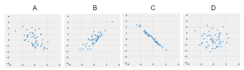 Look at the following four datasets. Rank them in order from weakest correlation to strongest correlation.