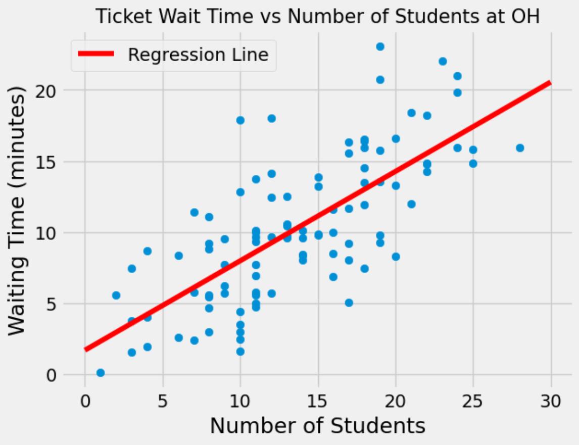 You just submitted a ticket at Office Hours and would like to know how long it will take to receive help. However, you don’t believe the estimated wait time displayed on the queue to be very accurate, so you decide to make your own predictions based on the total number of students present at OH when you submitted your ticket. You obtain data for 100 wait times and plot them below, also fitting a regression line to the data.