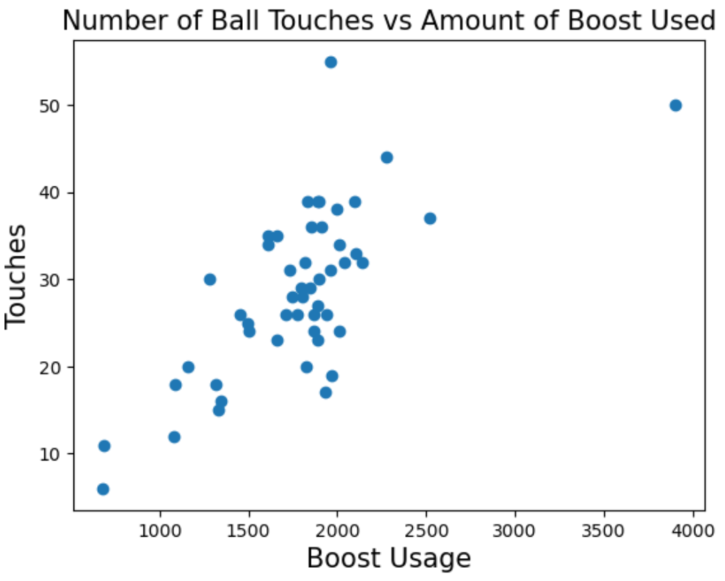 Conan has an unhealthy addiction to Rocket League, a game where players play soccer but with cars instead of people. Players can pick up boost pads that are scattered across the field, which players can use to make their cars go faster! Conan plays 50 games and records how much boost he used, as well as how many times he touched the ball in a given game.