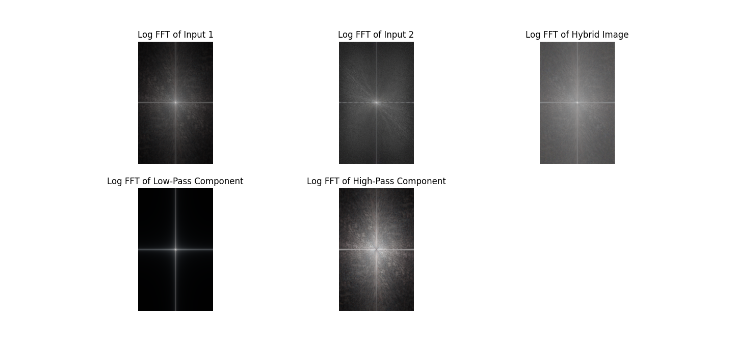 Input 1 is Professor Efros’ picture, while input 2 is Professor Kanazawa’s picture. At first glance, there’s not much to see from the original images, but once we apply low-pass and high-pass filtering, some interesting patterns emerge.