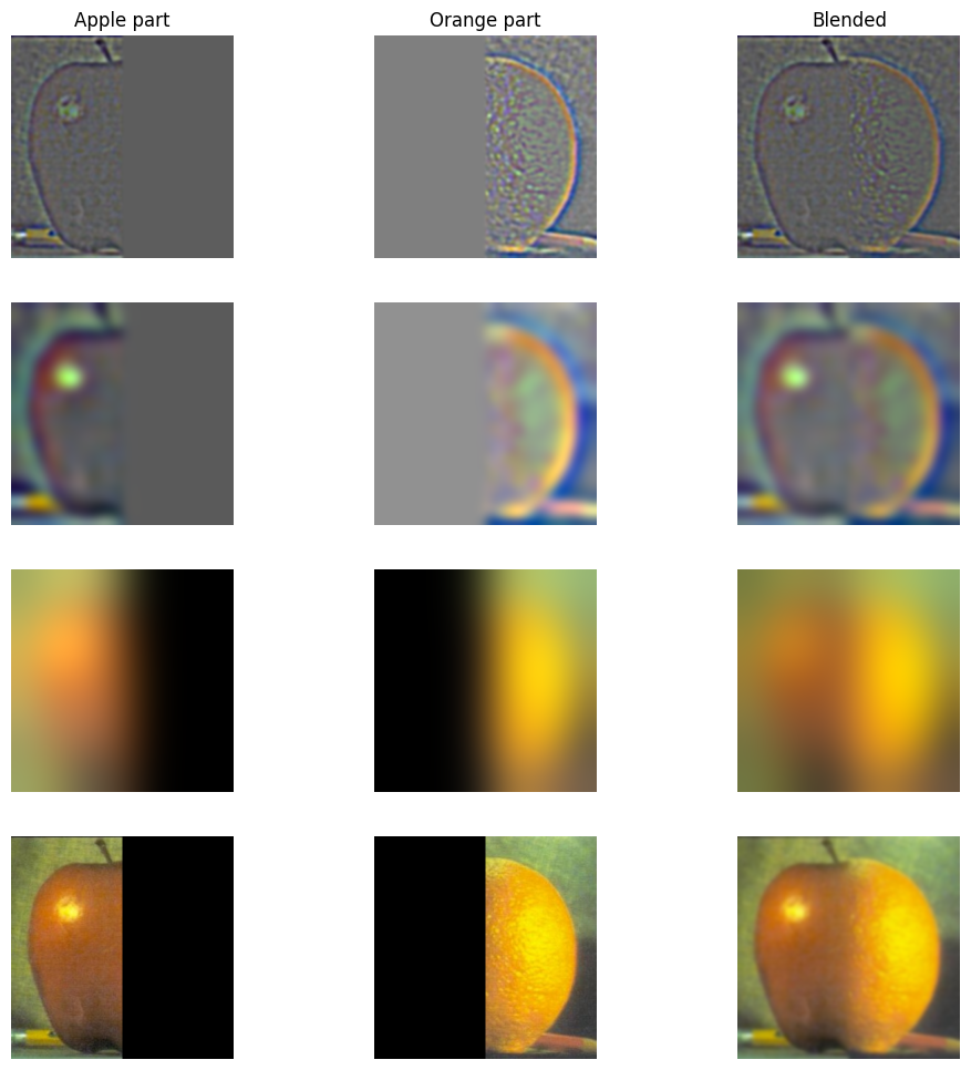 From top to bottom, we have the layers of the images after applying the binary mask for the orange and apple. One might say it’s just getting blurrier—and that’s true. But more importantly, because the images are being blurred using Gaussian and Laplacian stacks, we can merge the two fruits very nicely. The result looks pretty smooth, even though they are different fruits!