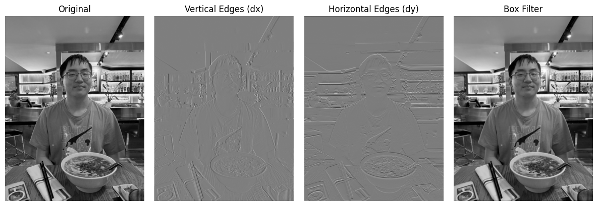 - The box filter looks almost identical to the original picture at first glance, but if you look closely, it is slightly blurrier. This is expected, since its formula is: