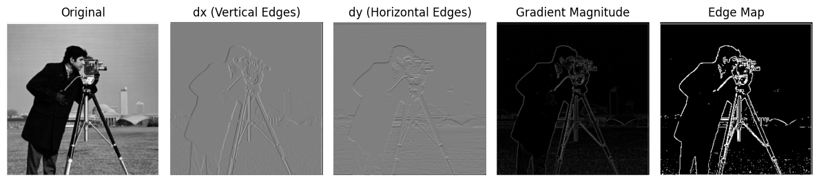 Continuing from the previous section, we now apply the finite difference filters to the classic cameraman.png image. This will further validate our explanation above.