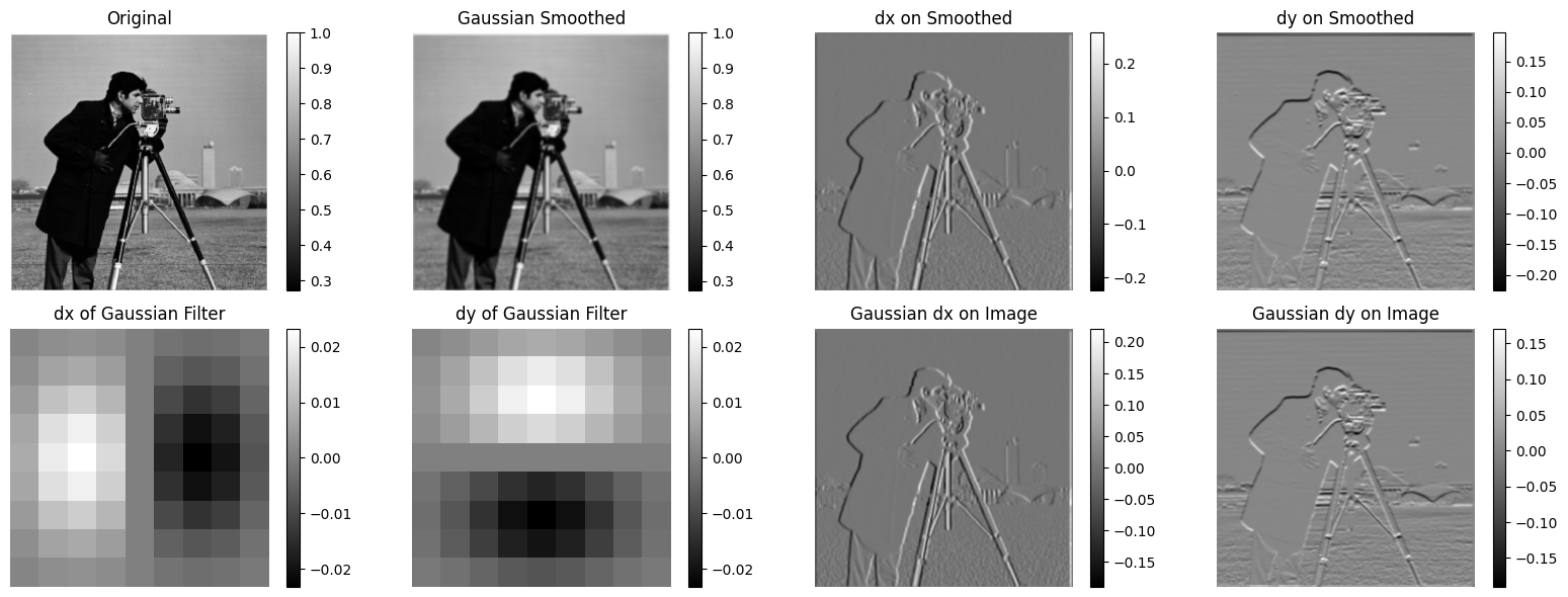 On the bottom-right corner, we have the \(D_x\) and \(D_y\) of the Gaussian filter applied to the image. Note that instead of applying the operations in a chain, we merged the two filters into one and applied it to the image. Interestingly, it looks exactly the same as the upper-right corner (because they are actually the same!).