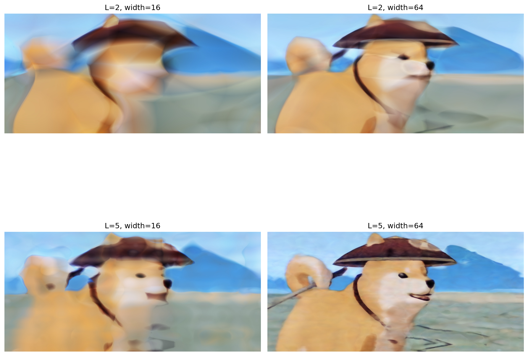 To analyze the effect of different hyperparameters, we trained the model with 2 choices of positional encoding frequency (L=2, L=5) and 2 choices of network width (16, 64), creating a 2×2 grid of results using low values to better observe their impact: