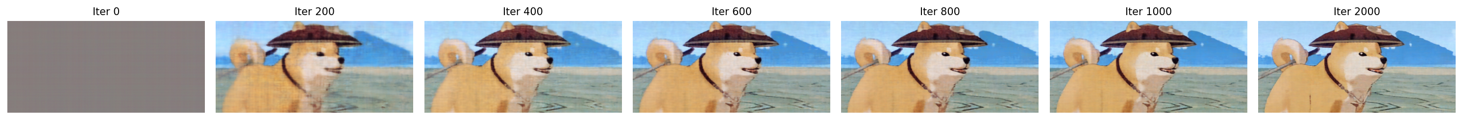 The following shows the training progression on the provided dog.png image (his name is Taroumaru!) at different iterations: