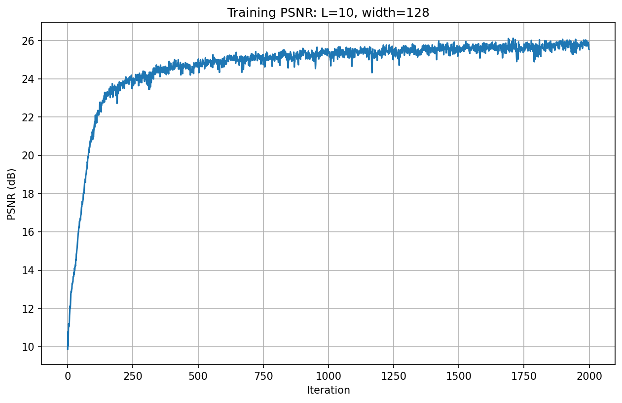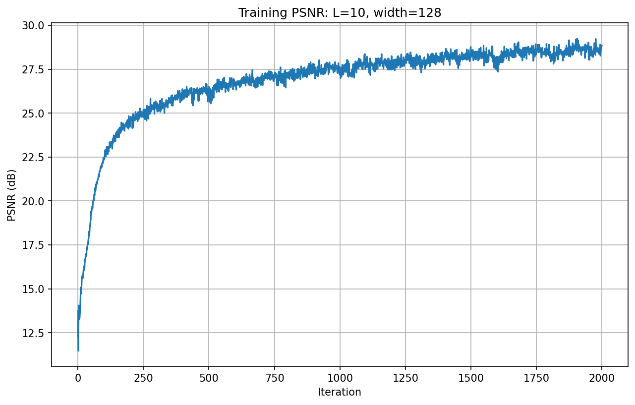 The following shows the PSNR curve during training on the fox image with default hyperparameters:
