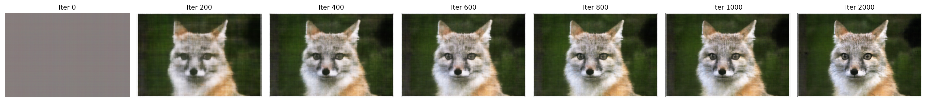 The following shows the training progression on the provided fox.jpg image at different iterations: