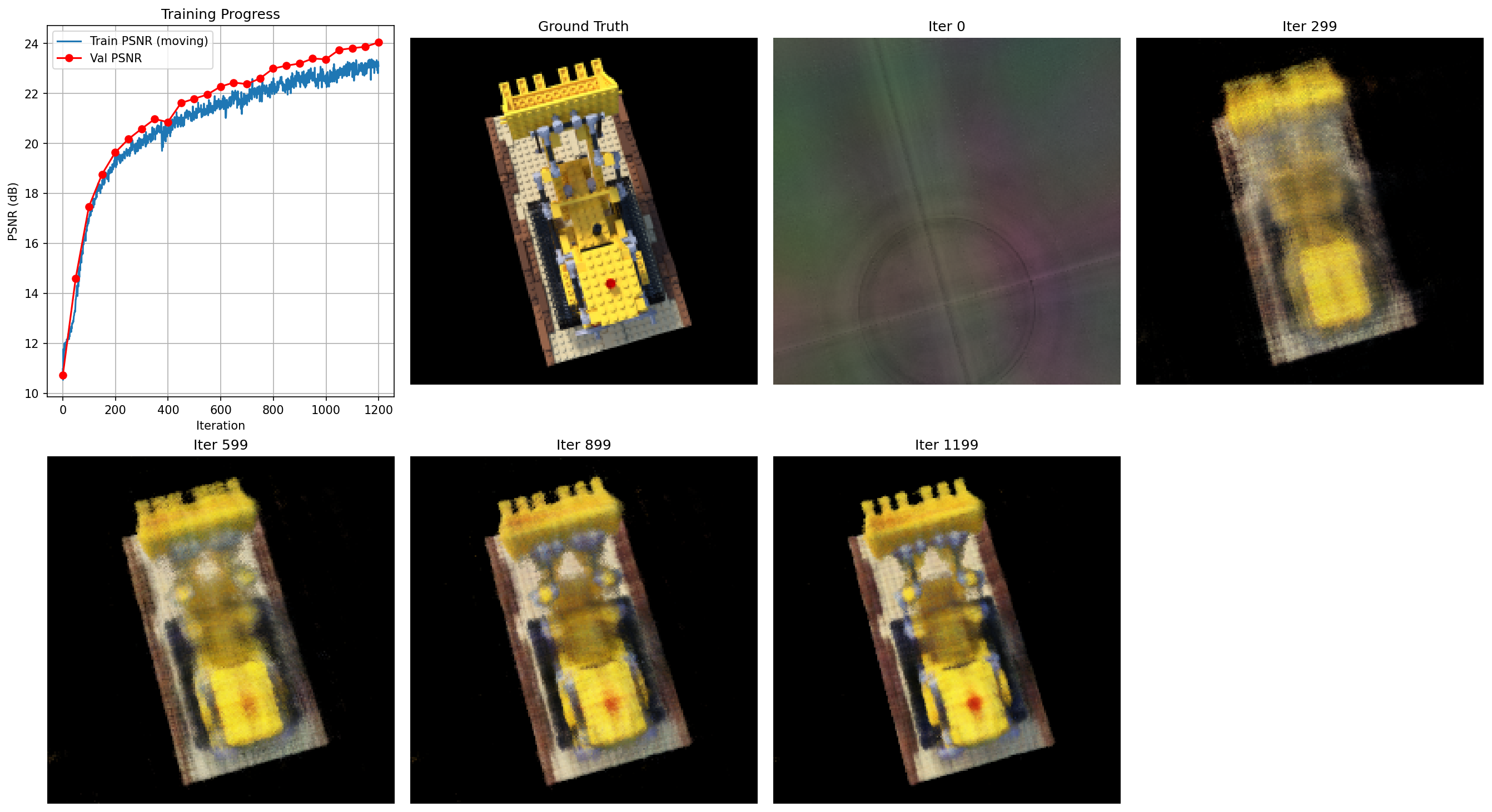 We will also see how the PSNR diagrams and during the training process, what the rendered images from a particular angle will look like: